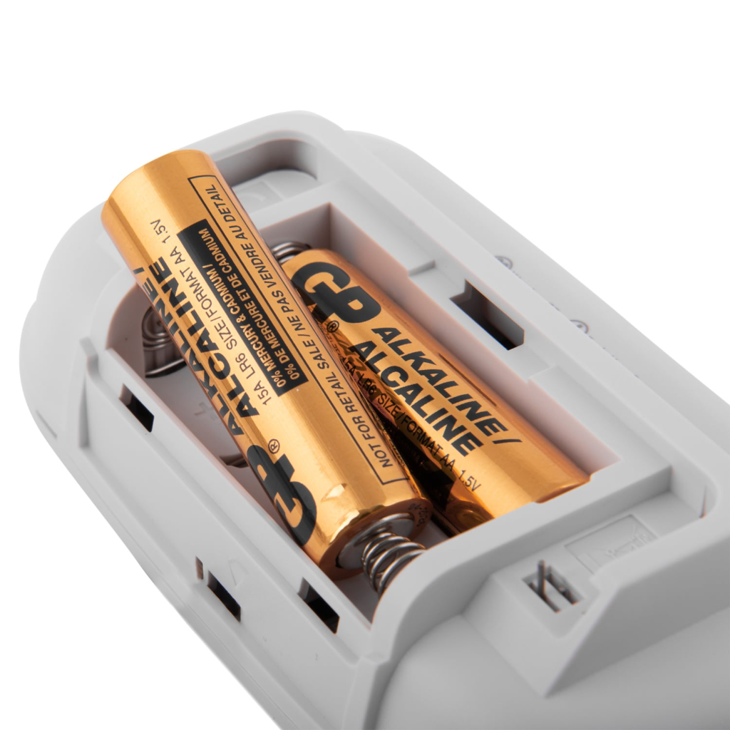 - Prietaisas tiekiamas su 2 AA baterijomis, kurias galima pakeisti, kai signalas išduoda žemo baterijos įkrovos įspėjamąjį signalą