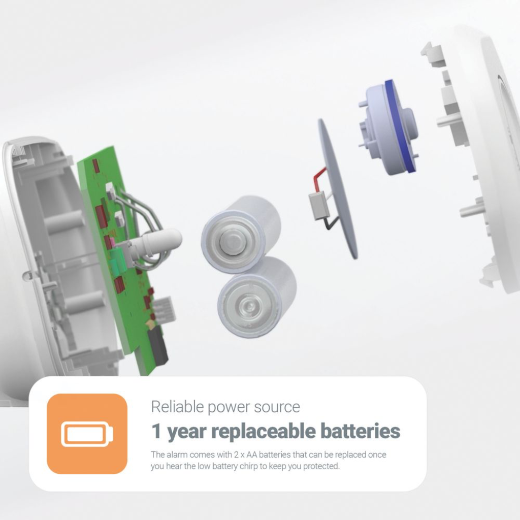 Aukštą prietaiso kokybę patvirtina BSI sertifikatas, atitinkantis EN50291-1:2018 ir EN50291-2:2019 standartus. Prietaisas maitinamas dviem keičiamomis AA baterijomis, kurios yra įtrauktos į komplektą. Dėl atitikties EN50291-2:2019 standartui jutiklis gali būti naudojamas ne tik gyvenamuosiuose namuose, bet ir kemperiuose, prikabinamuose nameliuose ir jachtose. Jutiklio tarnavimo laikas yra 10 metų.