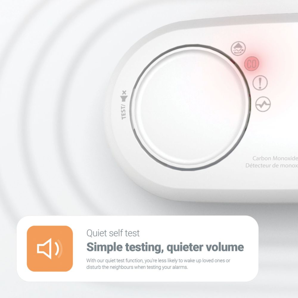 - Tyli bandymo funkcija leidžia atlikti diskretišką bandymą mažesniu garsumu, palyginti su standartiniais CO detektoriais