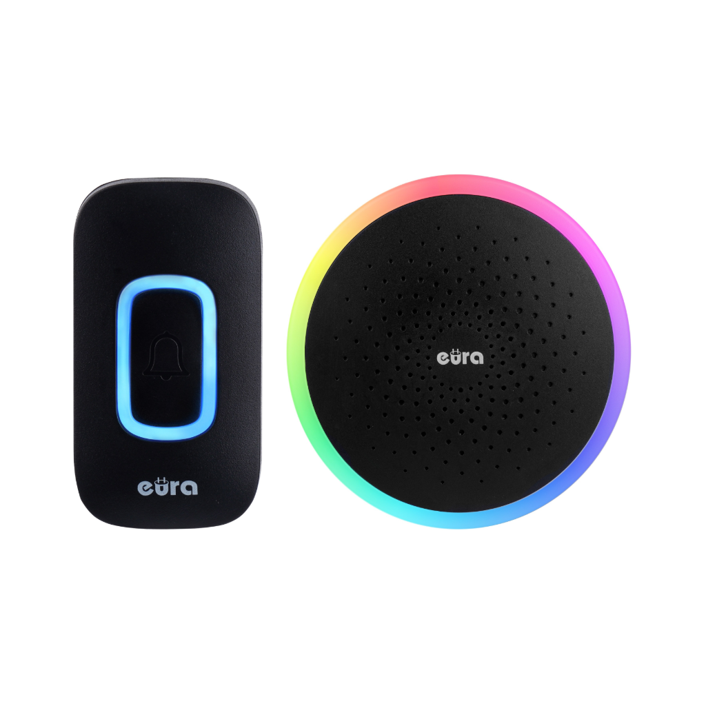 Bevielis durų skambutis Eura WDP-42A3 Black, kurį sudaro imtuvas ir siųstuvas, signalo dažnis 433,92 MHz, 60 pasirenkamų skambučio melodijų, veikimo nuotolis iki 200 metrų, skambučio maitinimo šaltinis yra 3 x LR6 baterijos, o mygtuko – CR2032 tipo ličio baterija. Bevielis durų skambutis Eura WDP-42A3 Black turi specialią išmaniąją kodavimo sistemą, kuri leidžia išplėsti rinkinį (su 1 imtuvu gali veikti iki 4 siųstuvų, su 1 siųstuvu gali veikti neribotas skaičius imtuvų).