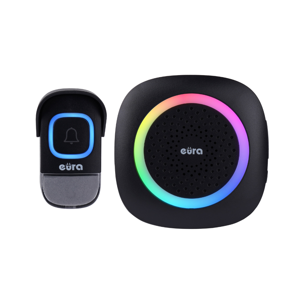 Bevielis durų skambutis Eura WDP-46A3 Black, kurio speciali išmanioji kodavimo sistema leidžia išplėsti rinkinį (su 1 imtuvu gali bendradarbiauti iki 4 siųstuvų, su 1 siųstuvu – neribotas skaičius imtuvų).
