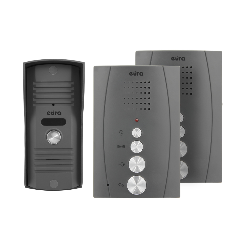 Domofonas Eura ADP-51A3 Difesa Graphite, kurio rinkinyje yra du grafito spalvos laisvų rankų įrangos unifonai, nedidelio dydžio išorinė kasetė ir 12 V nuolatinės srovės maitinimo šaltinis.