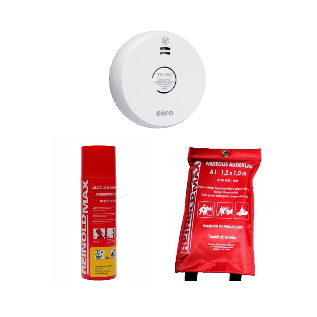 Dūmų detektoriaus, gesintuvo ir nedegaus audeklo rinkinys EUR-03, kurį sudaro: