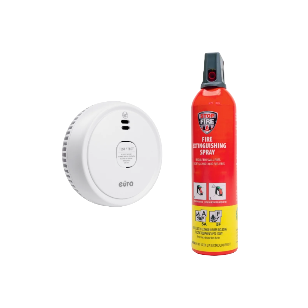 Dūmų detektoriaus ir gesintuvo rinkinys EUR-10 padės apsisaugoti nuo gaisro grėsmės namuose, biure ar bet kokioje patalpoje, kurioje yra gaisro tikimybė.