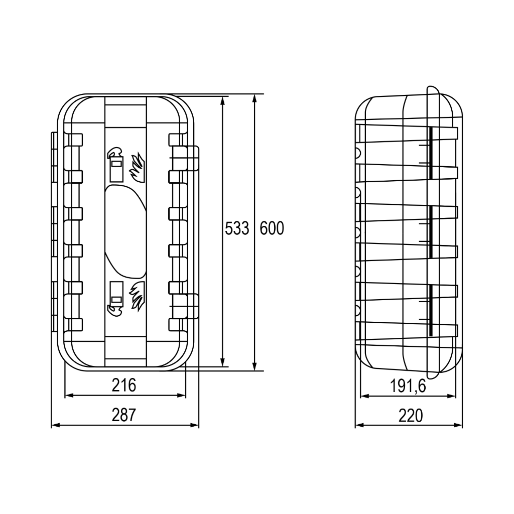 - Vidiniai matmenys: 216 x 533 x 191,6 mm