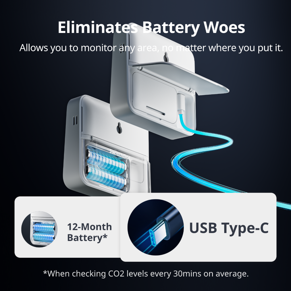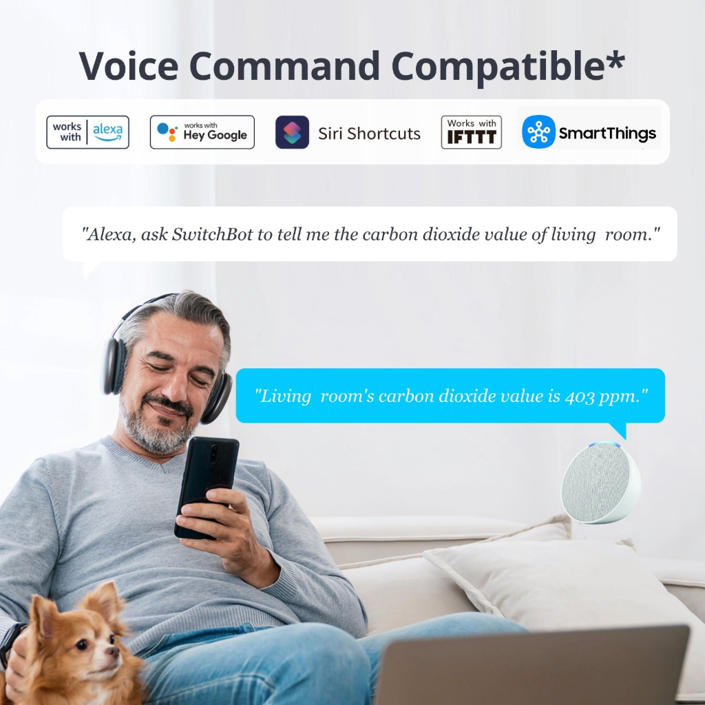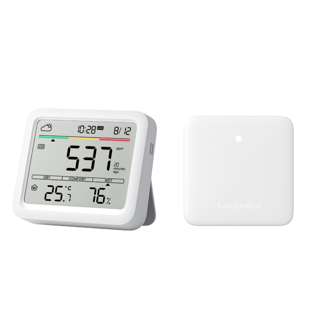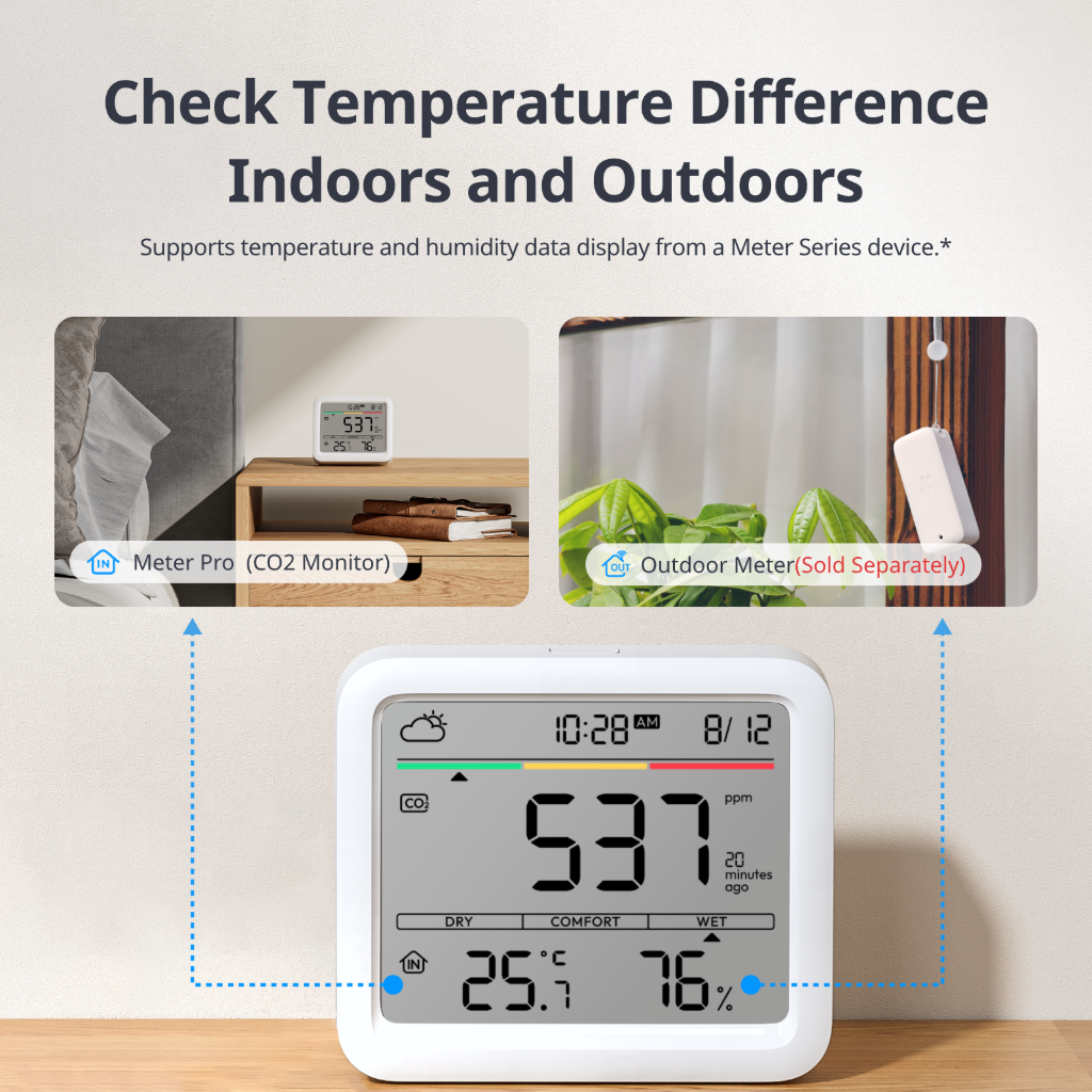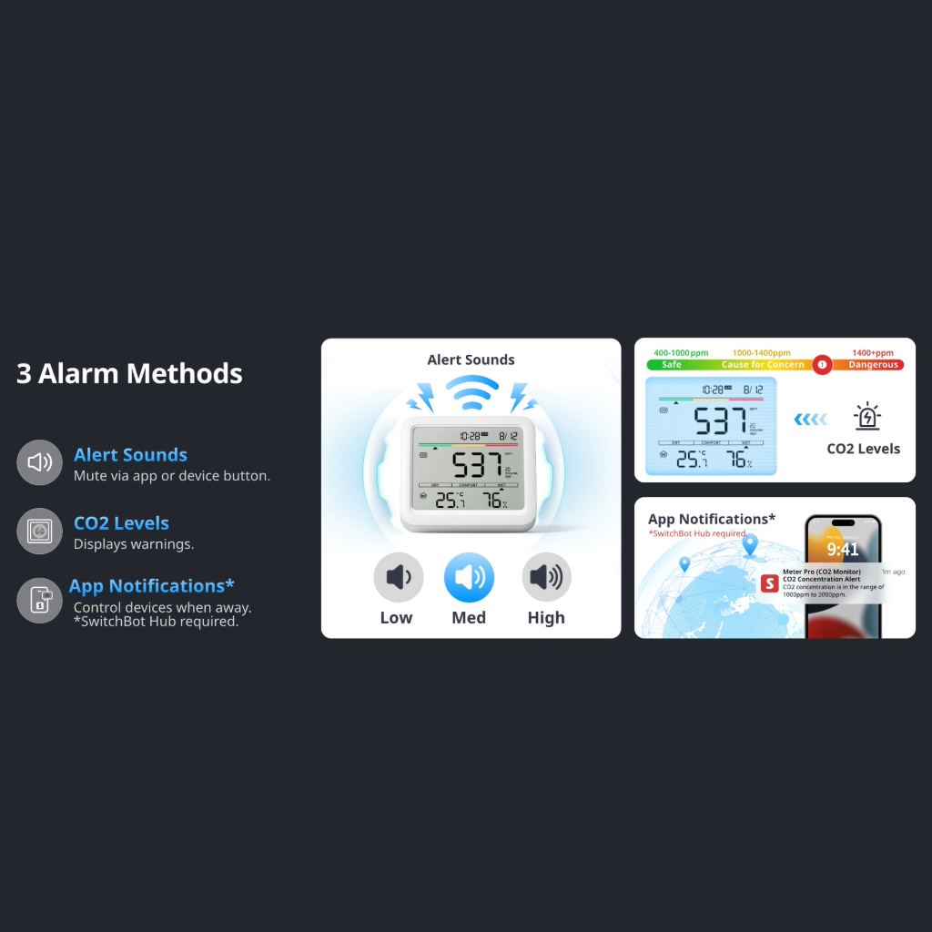 SwitchBot Meter Pro CO₂ Monitor išsiskiria didelio formato informatyviu LCD ekranu, aiškia komforto lygio indikacija, garsiniais ir vizualiniais įspėjimais bei galimybe rodyti vietinę 12 valandų orų prognozę (naudojant SwitchBot Hub). Integruotas „Bluetooth Low Energy“ (BLE) ryšys leidžia stebėti duomenis „SwitchBot“ programėlėje, o naudojant SwitchBot Hub (Mini arba Hub 2) – matyti rodmenis nuotoliniu būdu per „Wi-Fi“ ir integruoti į išmaniųjų namų automatizavimo scenarijus.