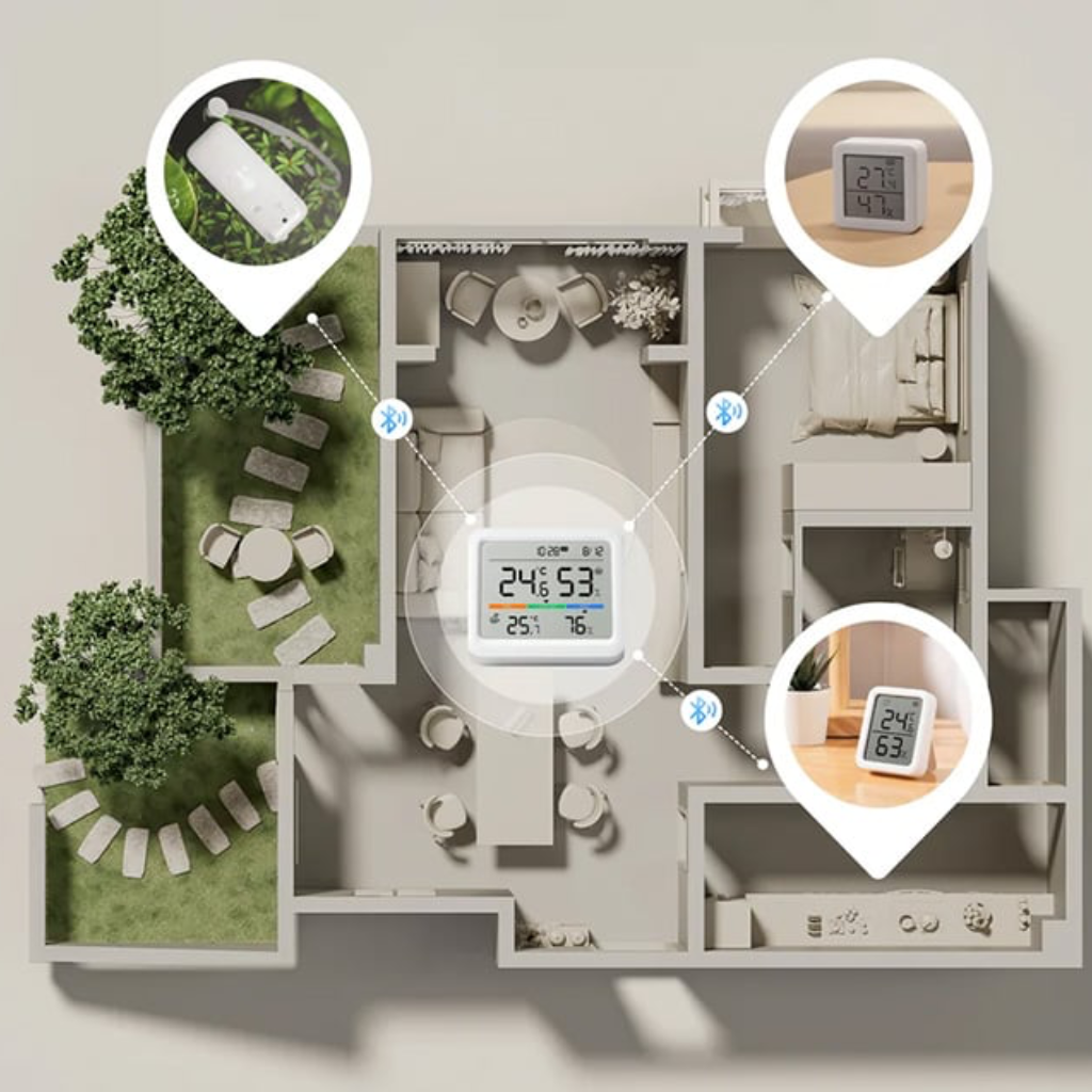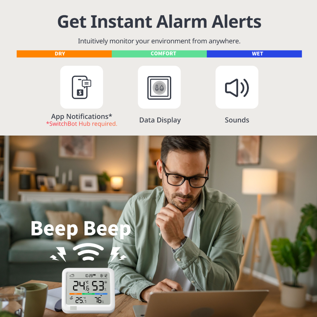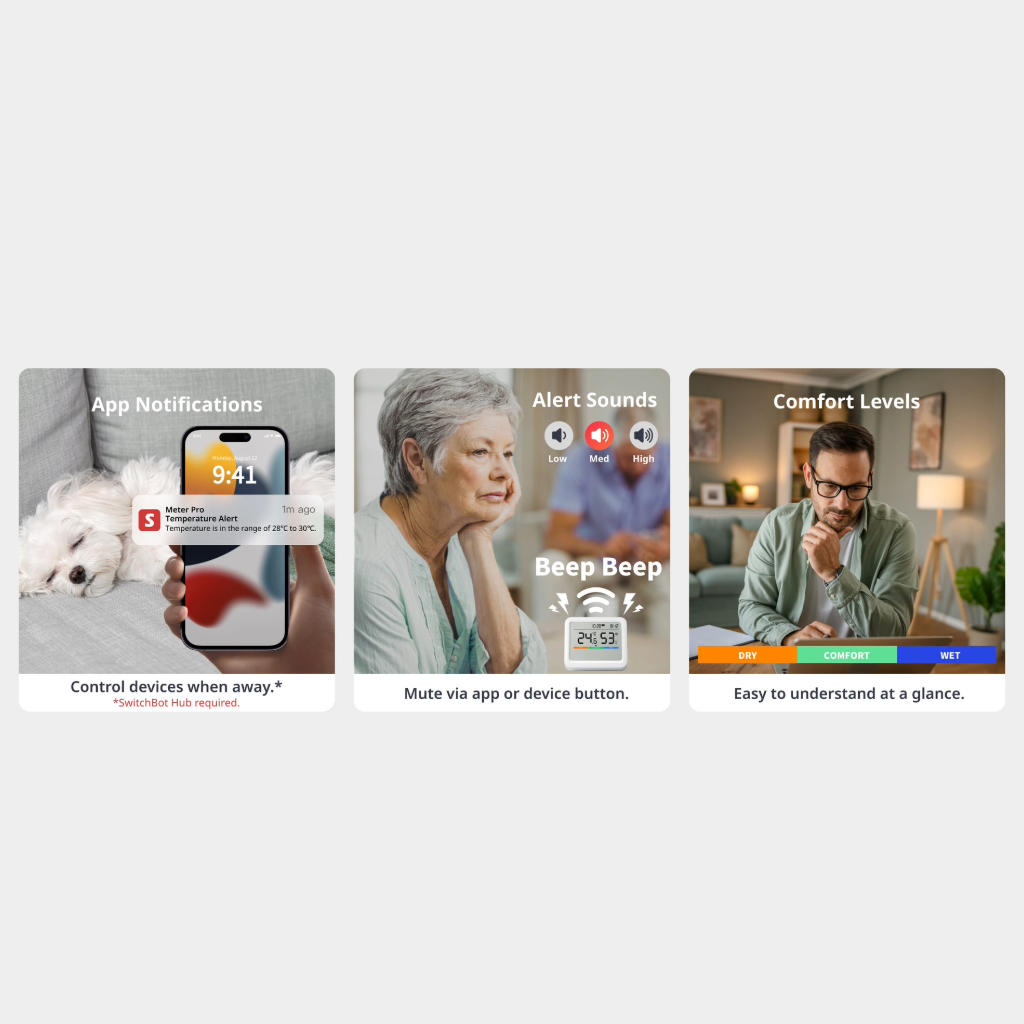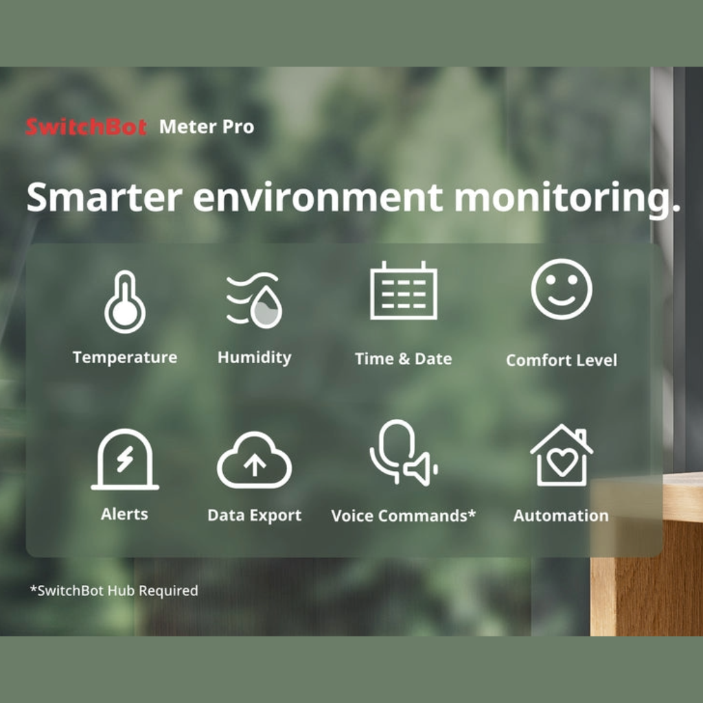 SwitchBot Meter Pro išsiskiria didelio formato ekranu, komforto lygio indikacija, orų prognozės rodymu ir išplėstomis duomenų saugojimo galimybėmis. Integruotas „Bluetooth Low Energy“ (BLE) ryšys leidžia peržiūrėti duomenis „SwitchBot“ programėlėje, o naudojant kartu su SwitchBot Hub (Mini arba Hub 2), įrenginys gali būti stebimas nuotoliniu būdu per „Wi-Fi“, integruojamas į išmaniųjų namų scenarijus ir trečiųjų šalių sistemas.