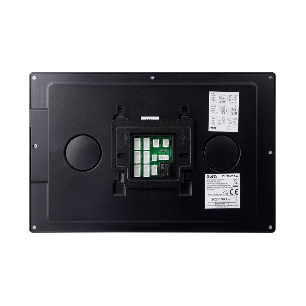 Vaizdo domofonas Eura VDP-85A3 Black turi didelį 10,1″ ekraną, leidžiantį patogiai stebėti vaizdą. Įrenginys suteikia galimybę fotografuoti ir įrašyti vaizdo įrašus į microSD kortelę (iki 128 GB). AHD technologija užtikrina 1024 × 600 raišką ir aiškų, detalų vaizdą. Integruotas WiFi modulis leidžia valdyti įrenginį nuotoliniu būdu per „Tuya“ programėlę (Android ir iOS). Paspaudus iškvietimo mygtuką, skambutis vienu metu perduodamas tiek į monitorių, tiek į išmanųjį telefoną, o per programėlę galima ne tik atsiliepti, bet ir valdyti elektrozaktą ar vartų automatiką.