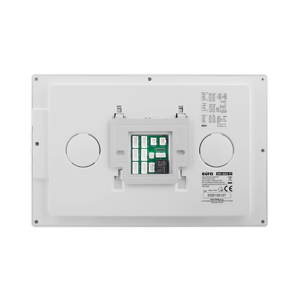 Vaizdo domofonas Eura VDP-85A3 White turi didelį 10,1″ ekraną, leidžiantį patogiai stebėti vaizdą. Įrenginys suteikia galimybę fotografuoti ir įrašyti vaizdo įrašus į microSD kortelę (iki 128 GB). AHD technologija užtikrina 1024 × 600 raišką ir aiškų, detalų vaizdą. Integruotas WiFi modulis leidžia valdyti įrenginį nuotoliniu būdu per „Tuya“ programėlę (Android ir iOS). Paspaudus iškvietimo mygtuką, skambutis vienu metu perduodamas tiek į monitorių, tiek į išmanųjį telefoną, o per programėlę galima ne tik atsiliepti, bet ir valdyti elektrozaktą ar vartų automatiką.