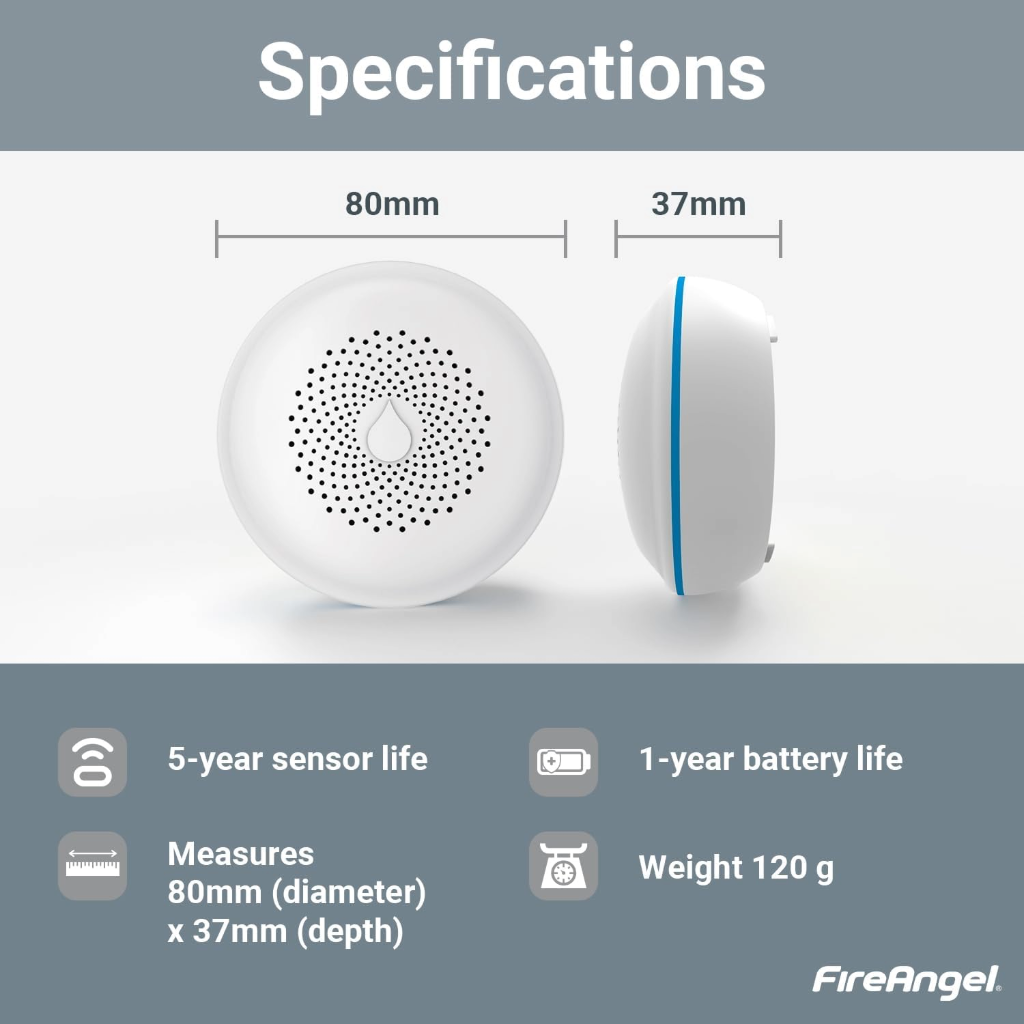 Vandens nuotėkio jutiklis FireAngel FA7011-EUX4 turi keičiamas baterijas, IP65 klasę, leidžiančią jį naudoti įvairiose vietose, ir garsinį įspėjimą apie išsikrovusią bateriją. Jutiklis sukurtas apsaugoti nuo nuotėkių, kad ir kur jie atsirastų.