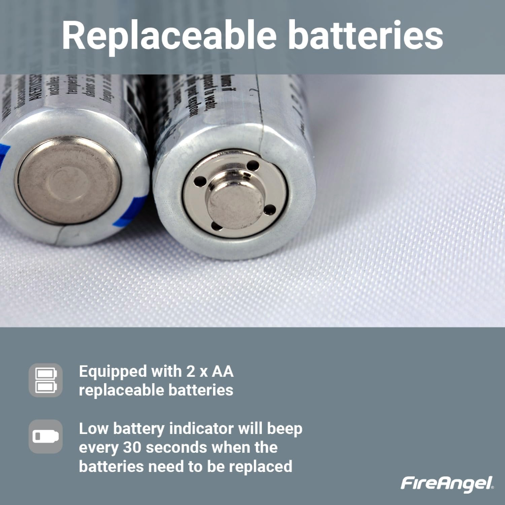 - Patogios keičiamos AA baterijos su žemu baterijos įkrovos signalu kas 30 sekundžių, užtikrinančiu nepertraukiamą apsaugą