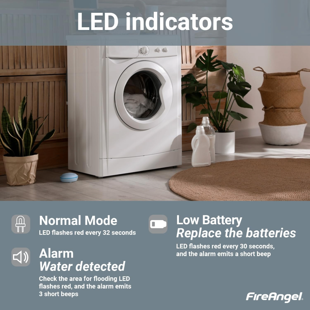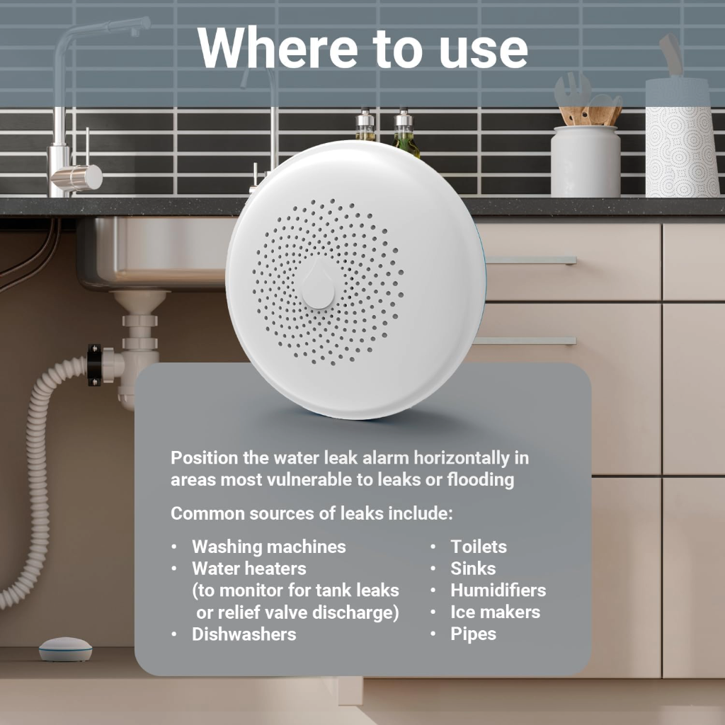 Kai yra aptiktas vanduo, jutiklis skleidžia garsų signalą ir mirksi raudona LED lempute, kad greitai atkreiptų jūsų dėmesį ir padėtų imtis veiksmų, kol neatsitiko rimta žala.